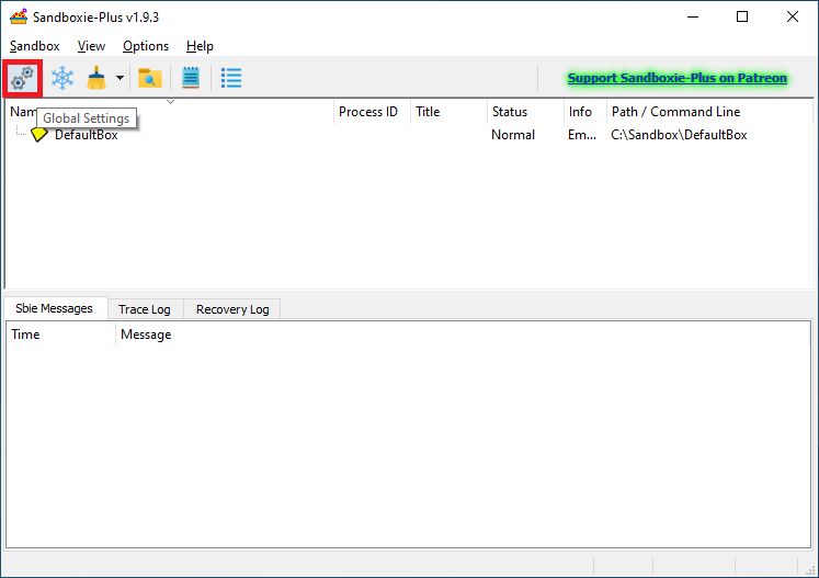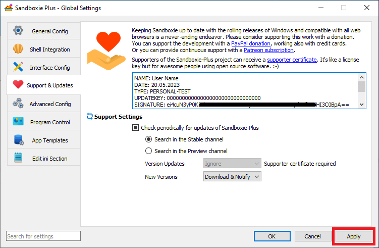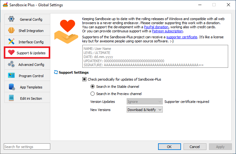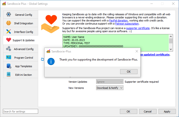 To apply a supporter certificate, please start Sandboxie Plus and open the global settings: