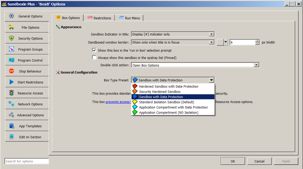 The setting for a privacy enhanced box can be enabled by adding UsePrivacyMode=y to the box settings section of Sandboxie Ini. It can also be enabled in the Sandman UI. Right-click on a box and select "Sandbox Options" from the drop-down menu (or simply double-click on a box) to bring up the Box Options UI. Select the box type preset as "Sandbox with Data Protection" (with a blue box icon) and click OK to apply changes. The status column of Sandman UI labels this box as Privacy Enhanced.