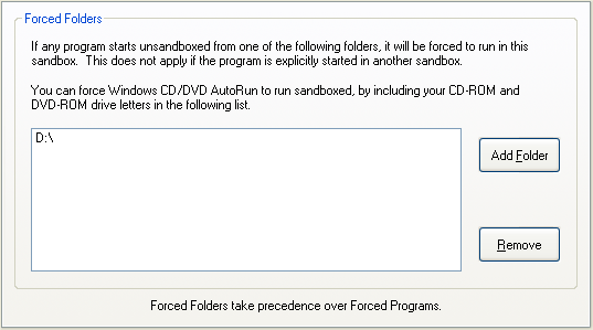 You may designate some folders for automatic, or forced, sandboxing. This means that if any program from that folder starts unsandboxed, then Sandboxie will automatically force that program to run in the sandbox. Some examples where this is useful: