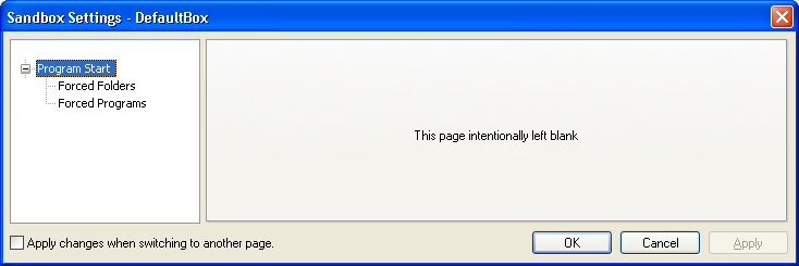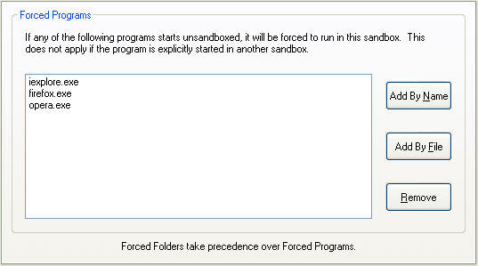 You may designate some program names for automatic, or forced, sandboxing. This means that if that program starts unsandboxed, then Sandboxie will automatically force that program to run in the sandbox. The most common use for the Forced Programs setting is to set the Web browser to automatically run sandboxed.
