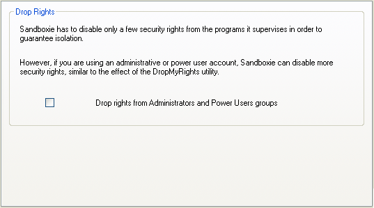 The setting in this page causes Sandboxie to strip administrative rights from programs running in this sandbox.