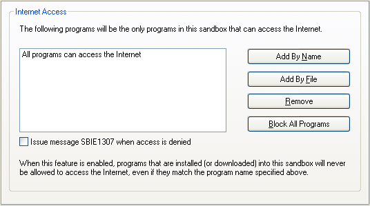 Use these settings to select which programs, if any, will be allowed to access the Internet in the sandbox. Initially, all programs in the sandbox can access the Internet.