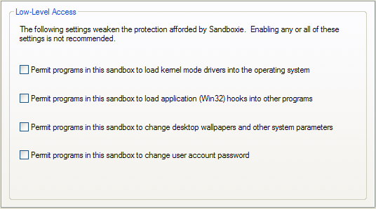 Settings in this section are intended to alter the default set of restrictions that Sandboxie places on programs running in the sandbox.