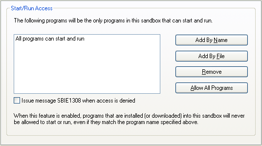 Use these settings to select which programs, if any, will be allowed to start and run in the sandbox. Initially, all programs in the sandbox can start and run in the sandbox.